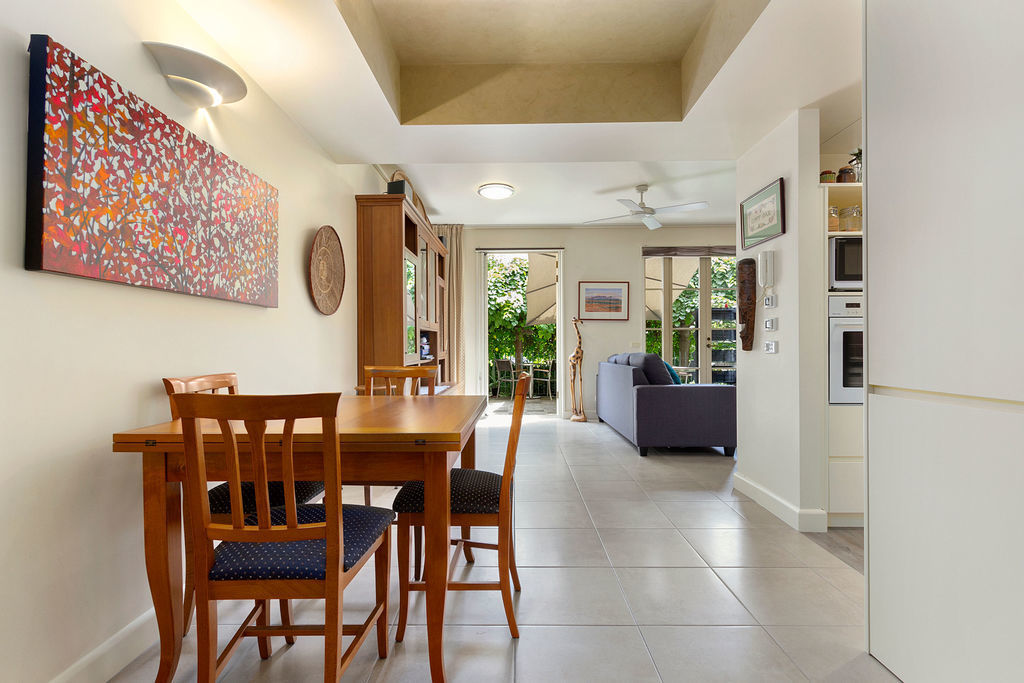Designed built by us photography by veeral furniture art objects by kate lee. Photo of a modern kitchendining combo in melbourne with light hardwood floors no fireplace grey walls and beige floor.